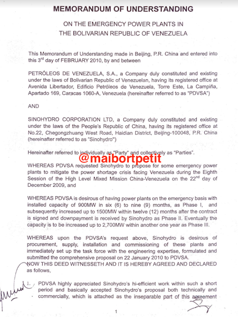 En nuestro poder se encuentra una copia del memorando de entendimiento suscrito el 3 de febrero de 2010 entre Petróleos de Venezuela S.A. (PDVSA) y la citada empresa china Sinohydro Corporation LTD y que sirvió de marco para que tuvieran lugar las negociaciones a que hemos hecho referencia en las líneas precedentes.