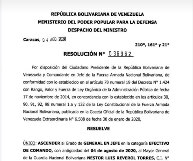 Por medio de una Resolución firmada por el Ministro de la Defensa, Vladimir Padrino López firmada este 4 de agosto de 2020, Nicolás Maduro Moros ascedió al actual Ministro de Interior y Justicia del régimen, Néstor Reverol a un grado de General en Jefe en la categoría de Efectivo de Comando.