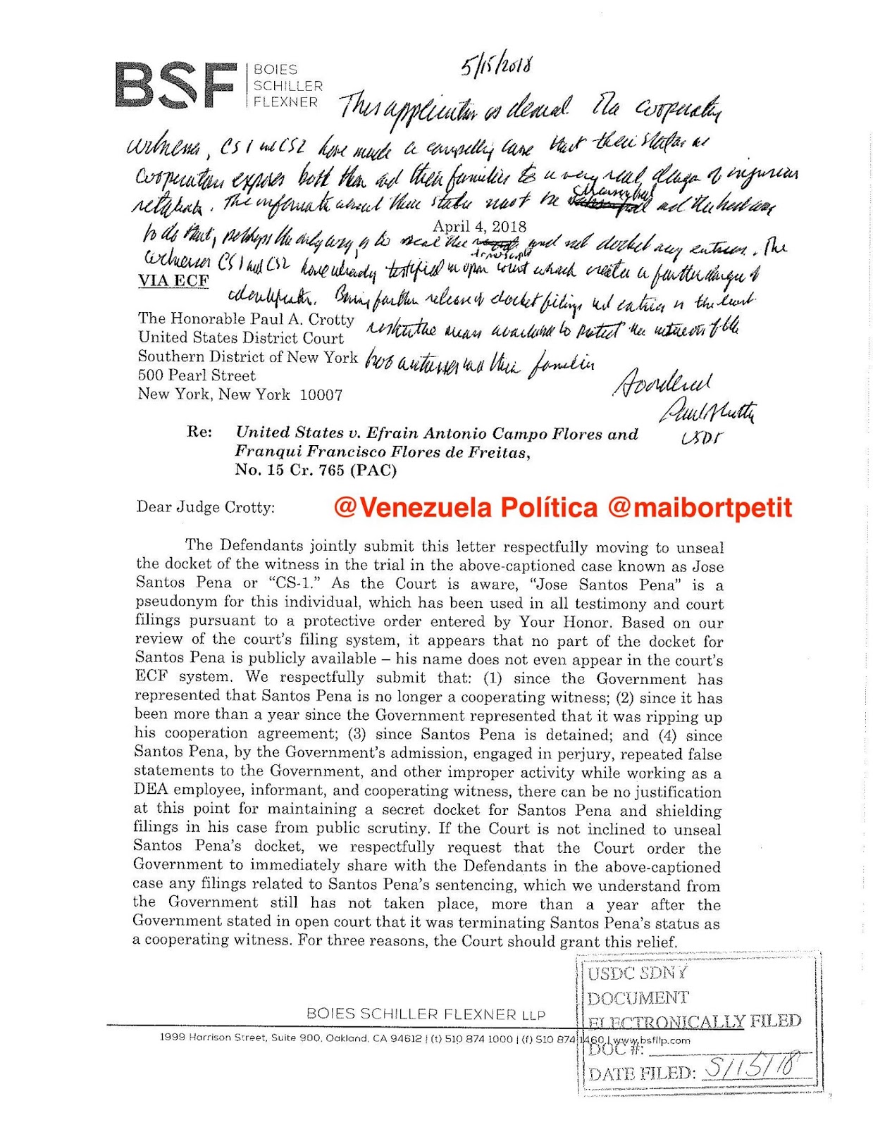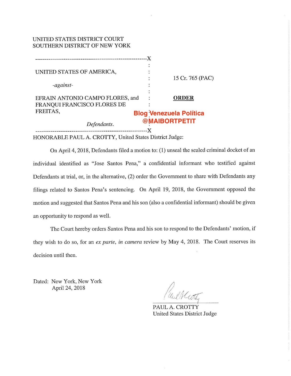 En fecha 24 de abril de 2018, el juez Crotty, había aprobado una moción presentada por Efraín Antonio Campo Flores y Franqui Francisco Flores de Freitas, el día 4 del citado mes y año, y ordenó a José Santos Peña y a su hijo, responder, si lo desean, a la solicitud de los sobrinos de la pareja presidencial de Venezuela. No obstante, los ex testigos de la DEA expusieron que revelar públicamente el expediente expondría a sus familiares a un peligro inminente.