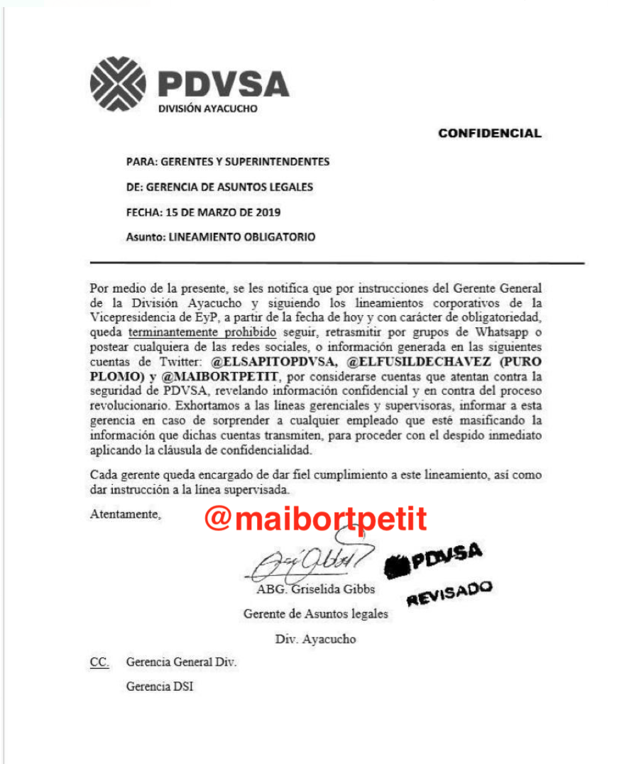 Con el despido inmediato «aplicando la cláusula de confidencialidad» fueron amenazados los trabajadores de Petróleos de Venezuela, División Ayacucho que sigan, transmitan en grupos de What’s App, o que posteen en las redes sociales información que se divulgue por las siguientes cuentas: @ELSAPITOPDVSA, @ELFUSILDECHAVEZ (PURO PLOMO) Y @MAIBORTPETIT.