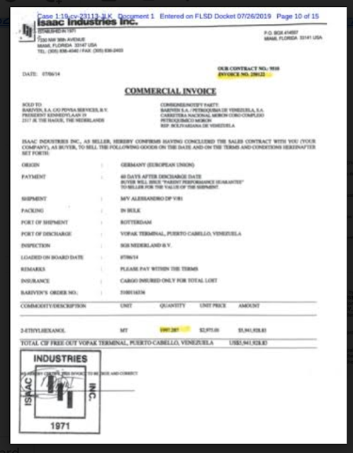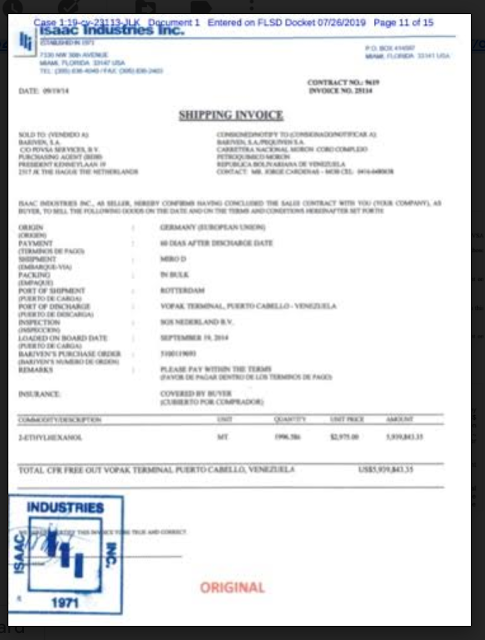 Se refiere en la demanda que en 2014, Isaac Industries Inc. suscribió un contrato con Bariven, PDVSA Services y PDVSA a las que vendió 2-etilhexanol por un monto de USD 17.831.772,18.