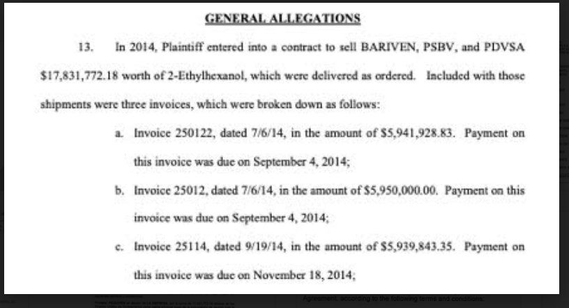 Se refiere en la demanda que en 2014, Isaac Industries Inc. suscribió un contrato con Bariven, PDVSA Services y PDVSA a las que vendió 2-etilhexanol por un monto de USD 17.831.772,18.