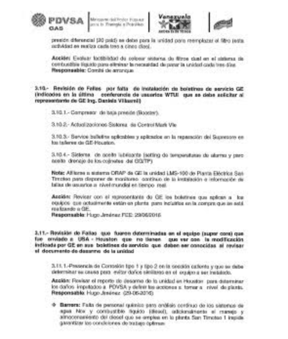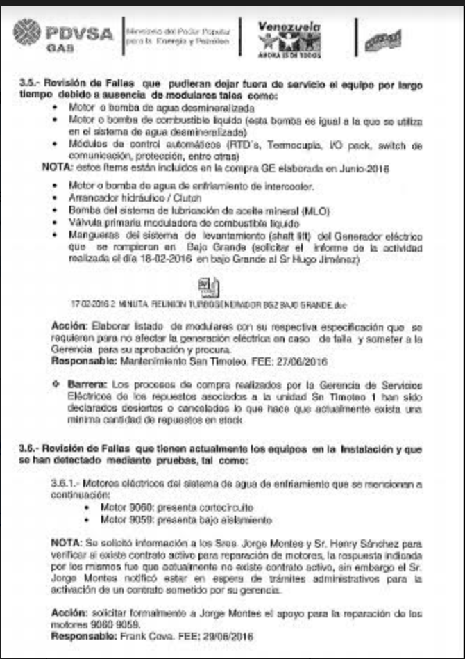 El 23 de junio de 2016, la minuta N° 2016-002-PEST de PDVSA Gas sobre la reunión que tuvo lugar en el edificio principal Tía Juana, preparada por Darwinng García, versó sobre la revisión técnico operacional de la Planta Eléctrica San Timoteo.