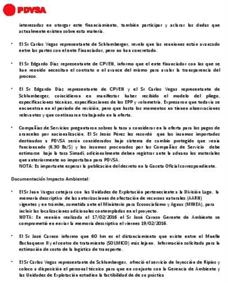Una serie de minutas de reuniones sostenidas en Petróleos de Venezuela. S.A. (PDVSA) en 2016 llegadas a nuestras manos, muestran los irregulares procesos que tuvieron lugar en la ejecución de la Planta Eléctrica de San Timoteo, así como la operaciones de servicios a pozos en la División Lago en el estado Zulia.