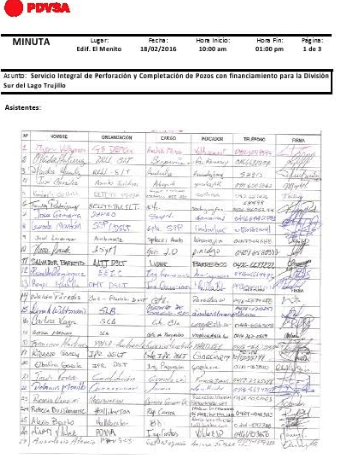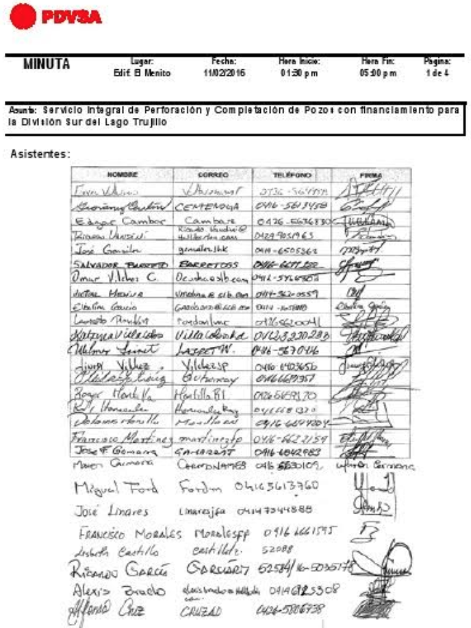 Ese mismo 18 de febrero de 2016, en El Menito tuvo lugar una reunión para tratar el servicio integral de perforación y completación de pozos con financiamiento para la División Sur del Lago Trujillo.