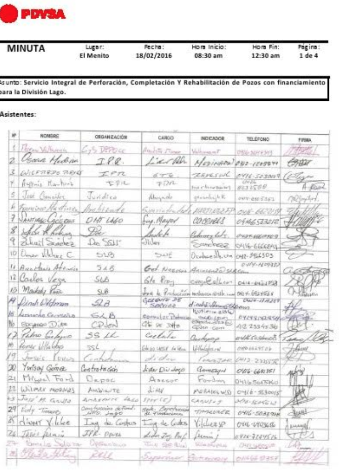 El 11 de febrero de 2016, se llevó a cabo una reunión en El Menito que versó sobre el servicio integral de perforación, completación y rehabilitación de pozos con financiamiento para la División Lago.