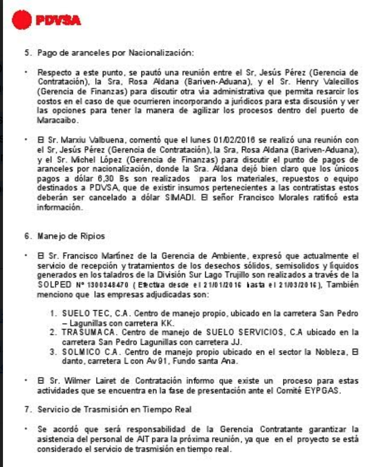 Se precisó que de acuerdo a reunión sostenida entre la Gerencia de Contratación, Bariven-Aduana y la Gerencia de Finanzas, se estableció que los únicos pagos a dólar a Bs. 6,30 eran los realizados para los materiales, repuestos o equipos destinados a PDVSA, mientras que los insumos destinados a otras compañías debían hacerse a tasa Simadi.