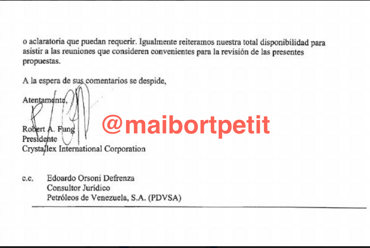 En la comunicación, que se remitió con copia a Edoardo J. Orsini Defrenza, consultor jurídico de Petróleos de Venezuela S.A. (PDVSA), el presidente de Crystallex manifestó su conciencia de que ambas partes poseían recursos legales y jurídicos a su alcance, tanto a favor como en contra de la ejecución del Laudo Arbitral CIADI, así como la disposición y capacidad de las partes para llevarlos a cabo.