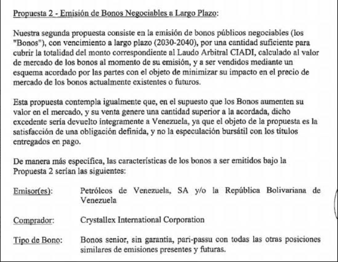 En primer lugar, Crystallex International Corporation propuso a PDVSA emitir un Bono Privado, no negociable, con vencimiento en el año 2021, un periodo exclusivo de pago de intereses de tres años y dos pagos de capital iguales en 2020 y 2021, como opción para pagar el Laudo Arbitral CIADI.