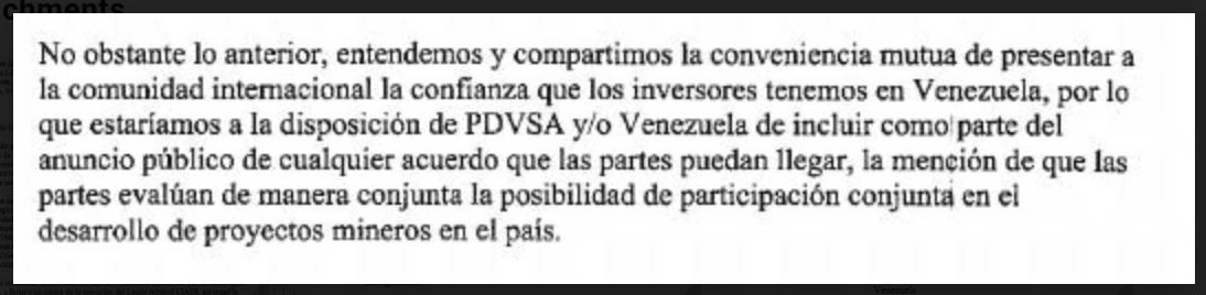 Asimismo, la comunicación revela que pese al largo proceso judicial que ambas partes han mantenido, PDVSA invitó a la minera canadiense a participar en los proyectos del Arco Minero a través de su asociación con la petrolera en una empresa mixta.