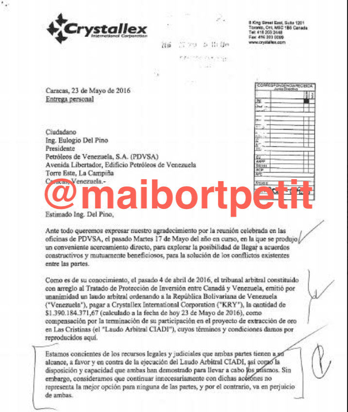La decisión unánime del tribunal arbitral tuvo lugar el 4 de abril de 2016 —un mes y 19 días antes de la correspondencia— y así se lo recordó el remitente a Del Pino al tiempo que refirió que dicho tribunal actuó de acuerdo al Tratado de Protección de Inversión entre Canadá y Venezuela, base sobre la cual se decidió el pago de la referida cifra por parte de la República Bolivariana de Venezuela a Crystallex International Corporation (KRY).