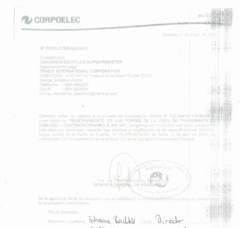 El 19 de mayo de 2016, Johannes Bachtold, presidente de Tradis International Corporation se dirigió a la Corporación Eléctrica Nacional, S.A, a la atención de la Gerencia General de Procura a cargo de Estiquio Lugo Gómez, para solicitarle “el reintegro de los gastos ocasionados por el pago a la compañía aseguradora, de las fianzas de anticipo y fiel cumplimiento por parte de nuestra empresa, las cuales fueron entregadas oportunamente a Corpoelec para dar cumplimiento a nuestra responsabilidad como contratista, una vez que se nos notificara que habíamos sido favorecidos con la Buena-Pro del proceso” de contratación N° CD-CAP10-T0181/2015 cuyo objeto era el «Mantenimiento de las Torres de la Línea de Transmisión El Tablazo —Cuatricentenario A 400KV».