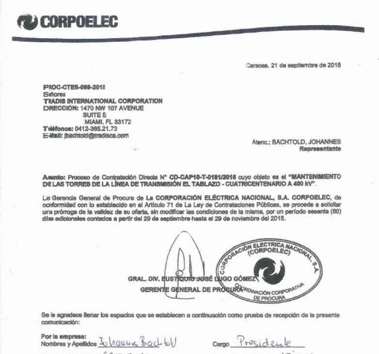 El 5 de octubre de 2015, el presidente de Tradis International Corporation, Johannes Bachtold, mediante comunicación N° PROC-CTES-099-2015 dirigida a la atención del gerente general de Procura de Corpoelec, Eustiquio Lugo Gómez, para confirmar la prórroga de la oferta presentada por la empresa a la estatal eléctrica referente al proceso de Mantenimiento de las torres de la línea de transmisión El Tablazo-Cuatricentenario a 400 KV, “sin modificar las condiciones, por un periodo de sesenta (60) días adicionales contados a partir del 29 de septiembre hasta el 29 de noviembre del 2015”.