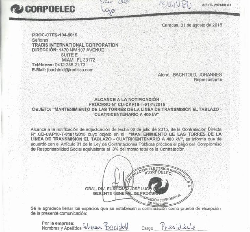 El 31 de agosto de 2015, el gerente general de Procura de Corpoelec, G/D Eustiquio José Lugo, dirigió la comunicación signada con el número PROC-CTES-104-2015 a Tradis International Corporation a la atención de Johannes Bachtold, presidente de la firma, para informarle acerca del Mantenimiento de las torres de la línea de transmisión El Tablazo-Cuatricentenario a 400 KV.