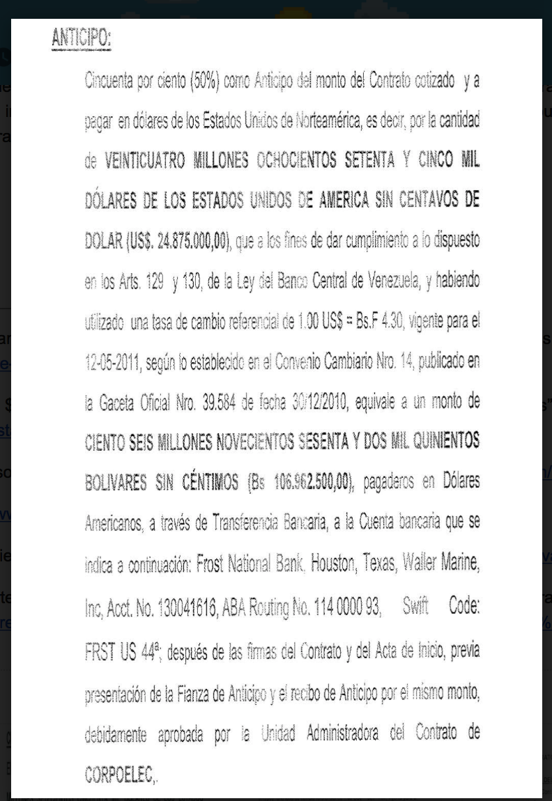 La cláusula quinta estipulaba lo relativo a la forma en que se realizaría el pago del precio del contrato por parte de Corpoelec a la Waller Marine previa verificación del cumplimiento de las obligaciones asumidas, indicando en primer término, que se cancelaría un anticipo del 50 por ciento del monto del contrato cotizado de USD 24.875.000,00, equivalentes a Bs. 106.962.500,00 calculados a Bs. 4,30 por dólar, mediante transferencia a la cuenta de la contratista (Frost National Bank, Houston, Texas, Waller Marine, lnc, Acct. N° 130041616, ABA Routing N° 114 0000 93, Swift Code: FRST US 44) a realizarse luego de la las firmas del contrato y del acta de inicio previa presentación de la fianza de anticipo por parte de la contratista.