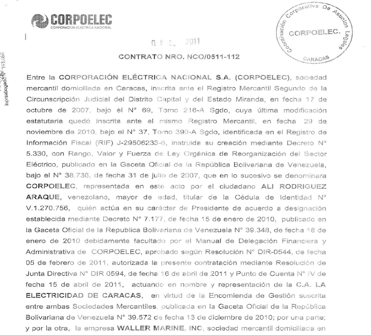 Pese a los antecedentes antes referidos, el 8 de septiembre de 2011, la Corporación Eléctrica Nacional, Corpoelec, representada por su presidente, Alí Rodríguez Araque, actuando en nombre y representación de la C.A. La Electricidad de Caracas, en virtud de la Encomienda de Gestión suscrita entre ambas Sociedades Mercantiles, publicada en la Gaceta Oficial de la República Bolivariana de Venezuela N» 39.572 de fecha 13 de diciembre de 2010, por una parte, y por la otra, la empresa Waller Marine Inc, representada por su vicepresidente, Anthony Paul Waller, suscribieron un contrato de suministro identificado con el N° NCO/0511-112.