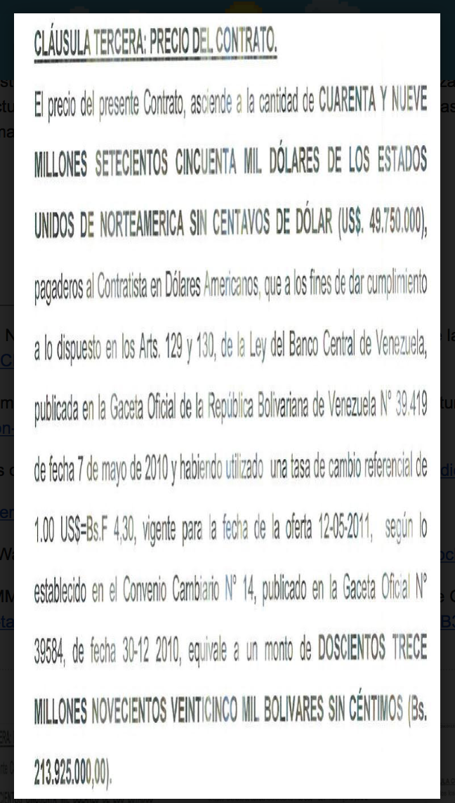 En la cláusula tercera se prevé lo relativo al precio del contrato, el cual quedó establecido en USD 49.750.000,00 equivalentes a Bs. 213.925.000,00, calculados a tasa de cambio de Bs. 4,30 por dólar.